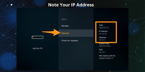 On your Fire TV Stick, go to 'Settings,' click 'Device,' then 'About,' and finally 'Network.' Note down the IP address.