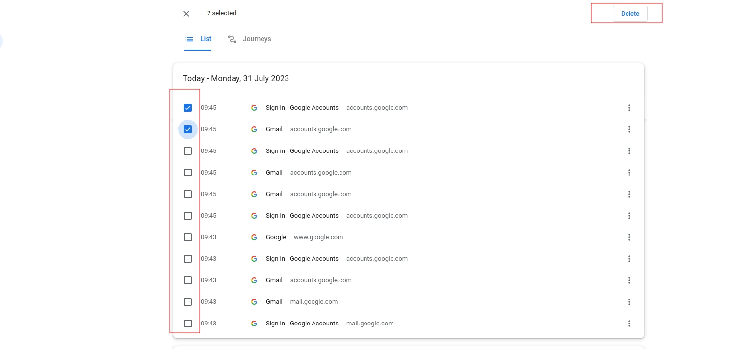 If you want to delete specific items from your search history, select the checkboxes next to each item you wish to remove. Then, click on the "Delete" button located at the upper right side of the page. This will delete the selected items from your history.