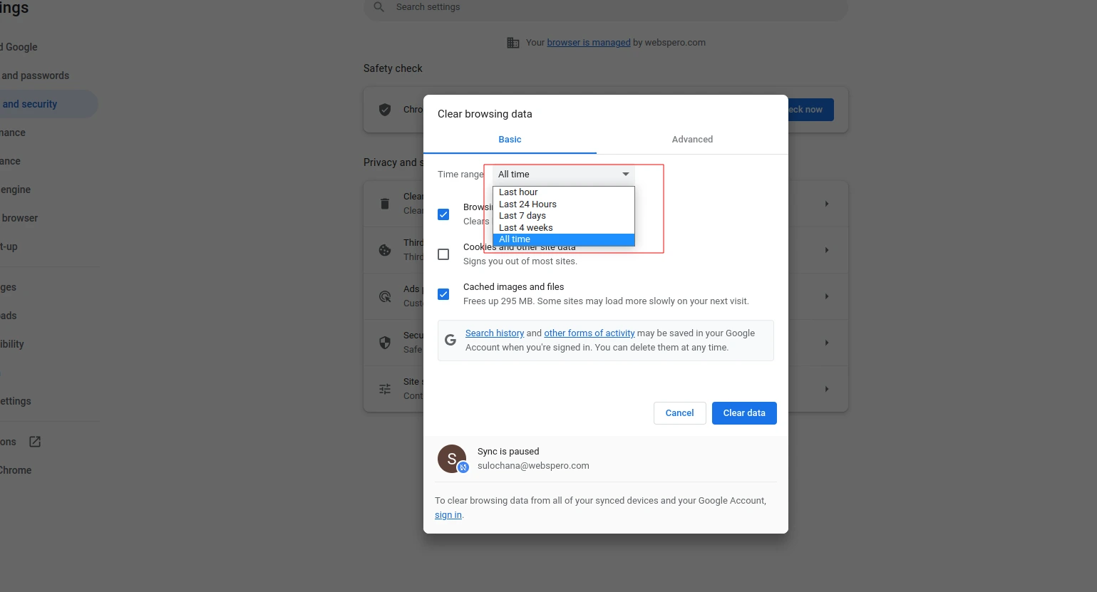 If you want to delete browsing data for a specific time period, select the time range from the drop-down menu in the pop-up window. For example, you can choose to delete data from the past hour, day, week, or month. If you want to delete your entire history, select "All time."