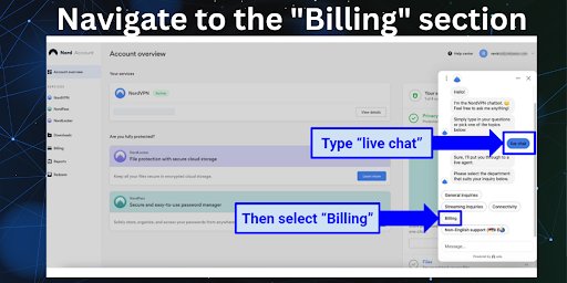 - In order to initiate a refund for your NordVPN subscription, reach out to us via email at support@nordvpn.com or start a live chat with our customer support agent by clicking on the chat icon in the lower right corner of your screen.