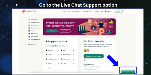 - Initiate a refund request by clicking on the live chat button located at the bottom-left corner of the screen. Contact the support team and request cancellation of your ExpressVPN account along with a refund.